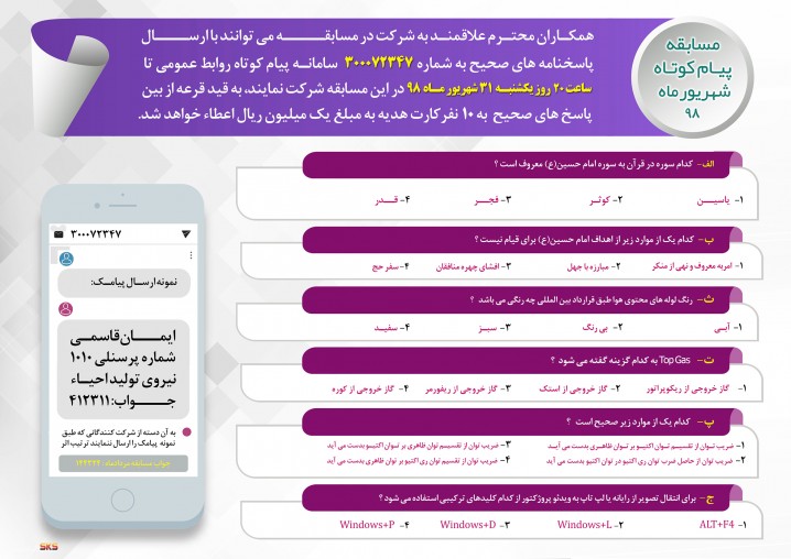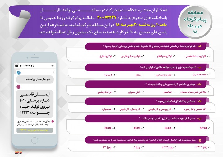 مسابقه پیام کوتاه شهریور ماه ۹۸ادامه مطلبهمکاران محترم علاقمند به شرکت در مسابقه میتوانند با ارسال پاسخنامههای صحیح در این مسابقه شرکت نمایند. به قید قرعه از بین پاسخهای صحیح به ۱۰ نفر کارت هدیه به مبلغ یک میلیون ریال اعطا خواهد شد.