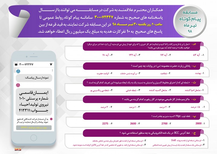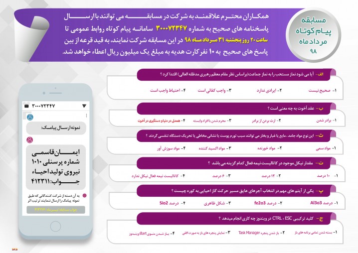 مسابقه پیام کوتاه تیر ماه ۹۸ادامه مطلبهمکاران محترم علاقمند به شرکت در مسابقه میتوانند با ارسال پاسخنامههای صحیح در این مسابقه شرکت نمایند. به قید قرعه از بین پاسخهای صحیح به ۱۰ نفر کارت هدیه به مبلغ یک میلیون ریال اعطا خواهد شد.