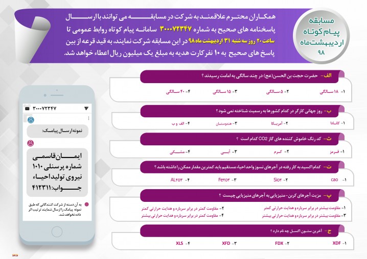 مسابقه پیام کوتاه اردیبهشت ماه ۹۸ادامه مطلبهمکاران محترم علاقمند به شرکت در مسابقه میتوانند با ارسال پاسخنامههای صحیح در این مسابقه شرکت نمایند. به قید قرعه از بین پاسخهای صحیح به ۱۰ نفر کارت هدیه به مبلغ یک میلیون ریال اعطا خواهد شد.