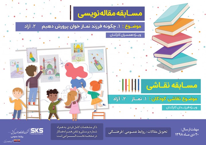 مسابقه مقاله نویسیادامه مطلبمسابقه مقاله نویسی با موضوع: ۱) چگونه فرزند نماز خوان پرورش دهیم ۲) آزاد. ویژه همسران کارکنان.
